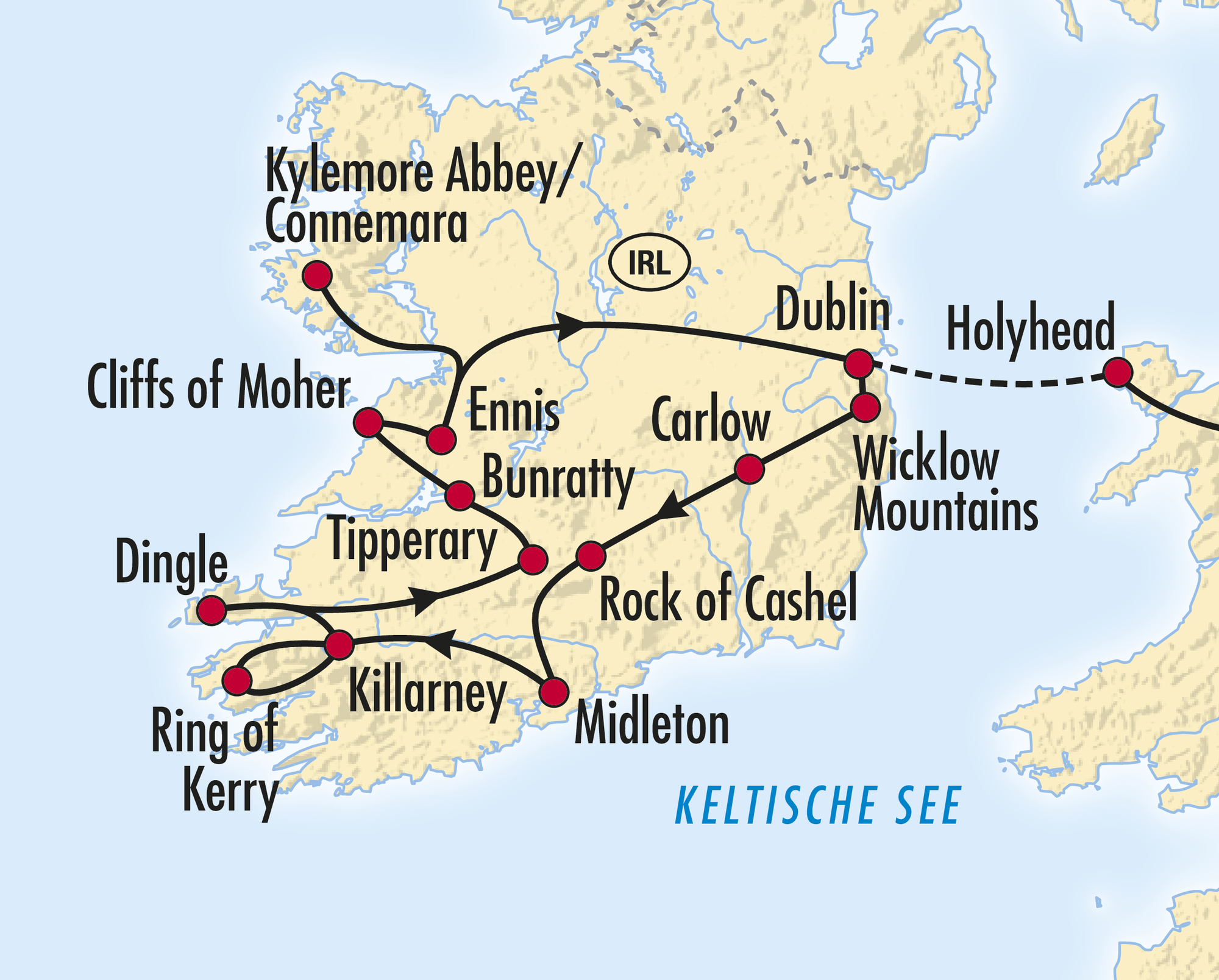 Während dieser Rundreise lernen Sie die schönsten Regionen Irlands kennen. Dazu gehören das wildromantische Connemara, die spektakulären Cliffs of Moher, die wunderschöne Halbinsel Dingle und das Küstenpanorama des Ring of Kerry. Das Irland der Vergangenheit präsentiert sich im Freilichtmuseum des Bunratty Folk Park. Der majestätische Rock of Cashel diente Königen und Geistlichen als Residenz. Selbstverständlich entdecken Sie auch die quirlige Hauptstadt Dublin.